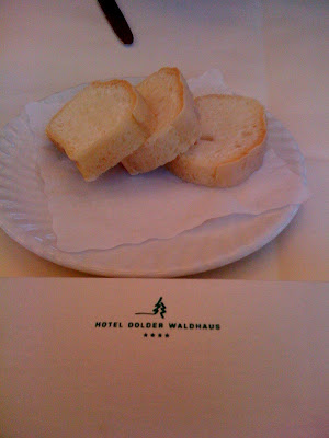 A short taxi ride took us up the hill to our hotel, the Dolder Waldhaus. For some very odd and unfathomable reason I LOVE funicular railways….and this hotel had one going right into it! Awesome. Having checked in we decided a long day of doing nothing but chatting, reading and watched the view speed past us had left us a bit tired so we headed for the hotel’s restaurant. Hopes weren’t particularly high but they had an outside terrace overlooking Zurich and it was a nice evening. As usual I explained my dietary restrictions, the waiter nodded and I thought I heard him say “I’ll get the gluten free bread”. No way, I thought, you must be imagining it. But no, the waiter reappeared and placed some freshly warmed gluten free bread in front of me. What are the chances?