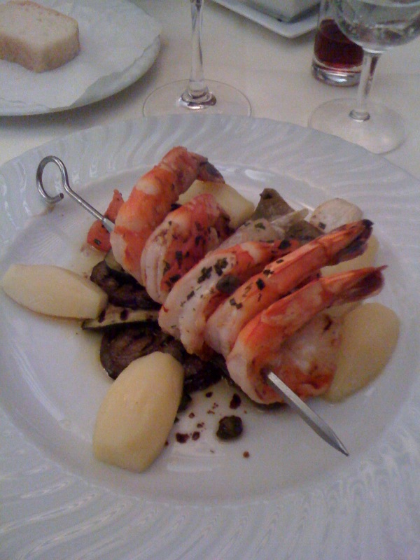 For the main course I had gorgeously ginormous skewered prawns. This dish should have been served with roast potatoes but the waiter – who genuinely took my food intolerance seriously – advised against as they had been dusted with flour before roasting. Instead they served with boiled potatoes and a selection of grilled vegetables.