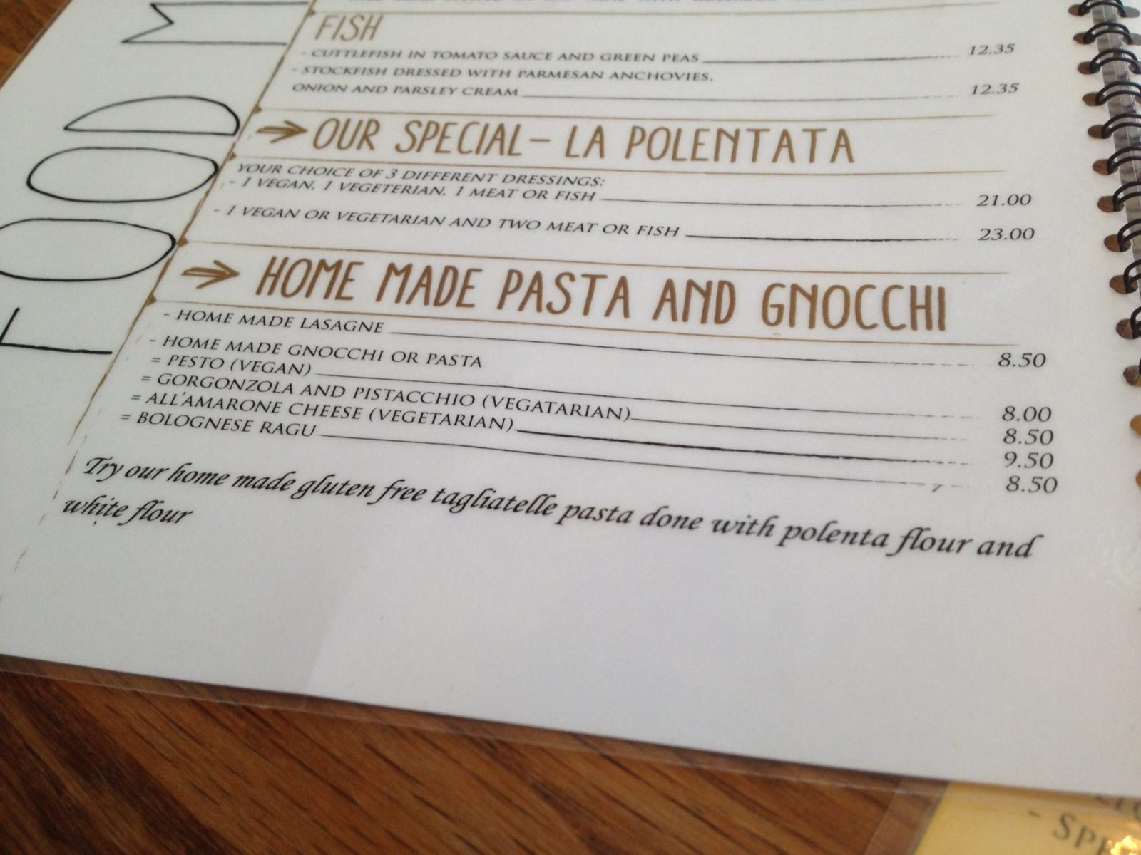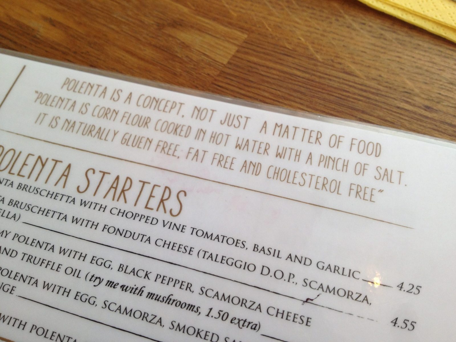 The entire menu at La Polenteria is gluten free. When I asked about gluten free options, the waiter proudly bounced over to the window and pointed to the Coeliac UK gluten free accreditation sticker in the window.