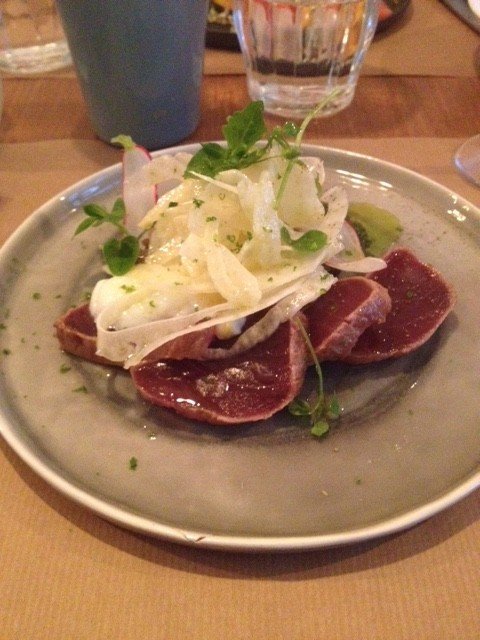 NoGlu occupies two floors. On the ground floor is the open kitchen with a single row of counter level seats facing it. We were seated in the dining room on the first floor. On the night we visited, a couple of tables were occupied by French speakers but at the majority of the tables were seated Brits and Americans. There are a few tables outside and it would be worth reserving these if you’re there on a hot night as it gets warm inside the restaurant.
