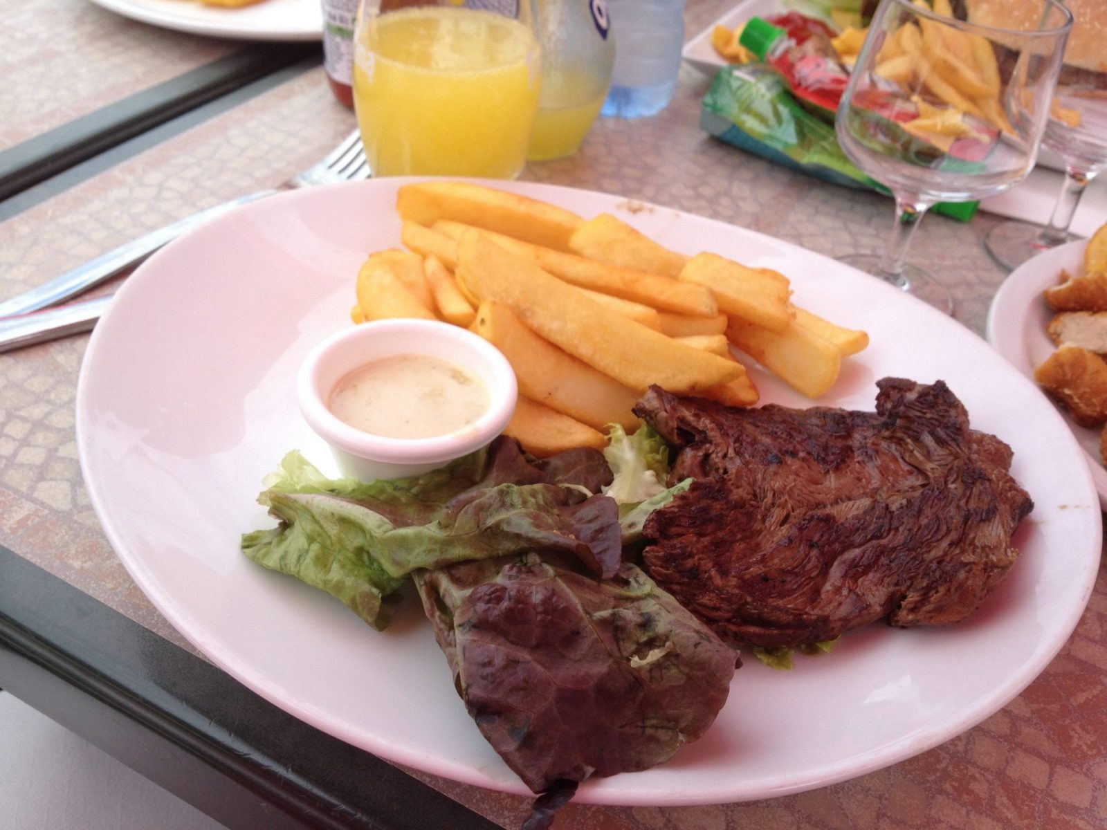 Kids meals: While I am not a particular fan of kids meals, in France many of the dishes from the regular menu were not really suitable for my just-turned 2 year olds. The default kids meal everywhere involved steak haché (basically a good quality hamburger but no bun) and frites. This should be gluten free as it’s essentially just chopped steak with seasoning. Some places had a poached fish fillet and other chicken nuggets (not gluten free) but generally there was little choice. However, as above, I discovered that what was listed on the menu was often not as provided. Mostly the menus stated dessert was ‘Un glace’ – an ice cream. What, in fact, the restaurants offered under the auspices of un glace varied from delicious homemade ice cream to a fluorescent coloured ice pop in a frozen plastic tube to a bowl of Smarties.